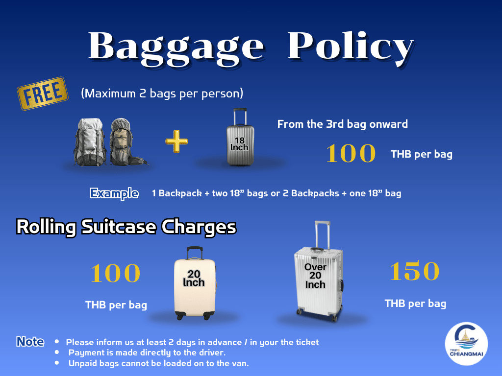 Luggage Policy Please inform us at least 2 days in advance if you have extra or large luggage. Luggage fees are paid directly to the driver. Unregistered bags cannot be loaded onto the van.